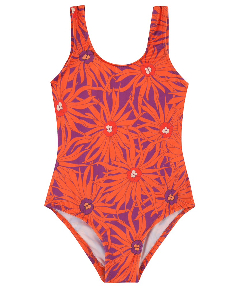 Floral orange printed one-piece with open back. Slips on Fits true to size UV protection Hand...