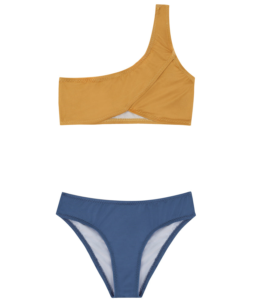 One-shoulder color block bikini. Slips on Fits true to size UV protection Hand wash cold...