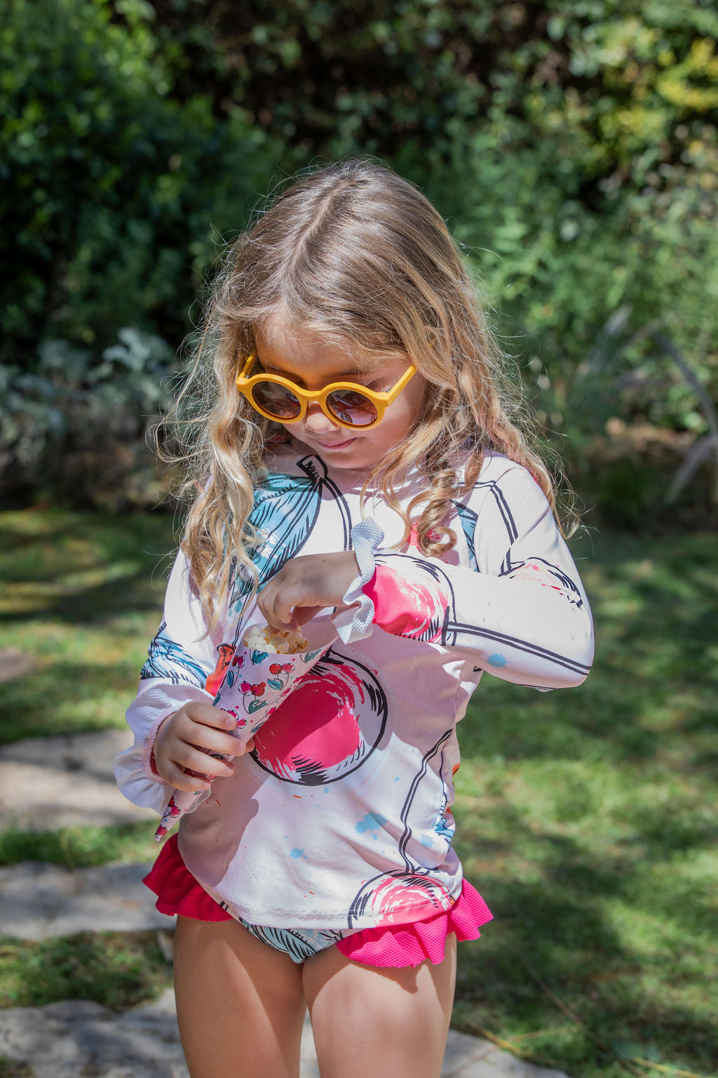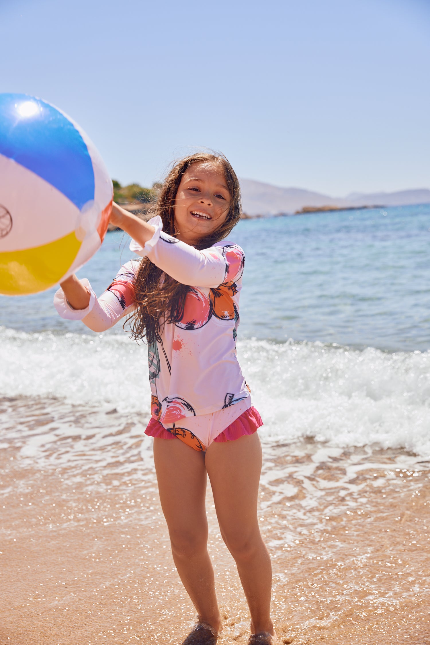 Sporty with a cute twist, long-sleeve bikini cut from soft stretch fabric. The long sleeves provide extra sun protection for the little ones!